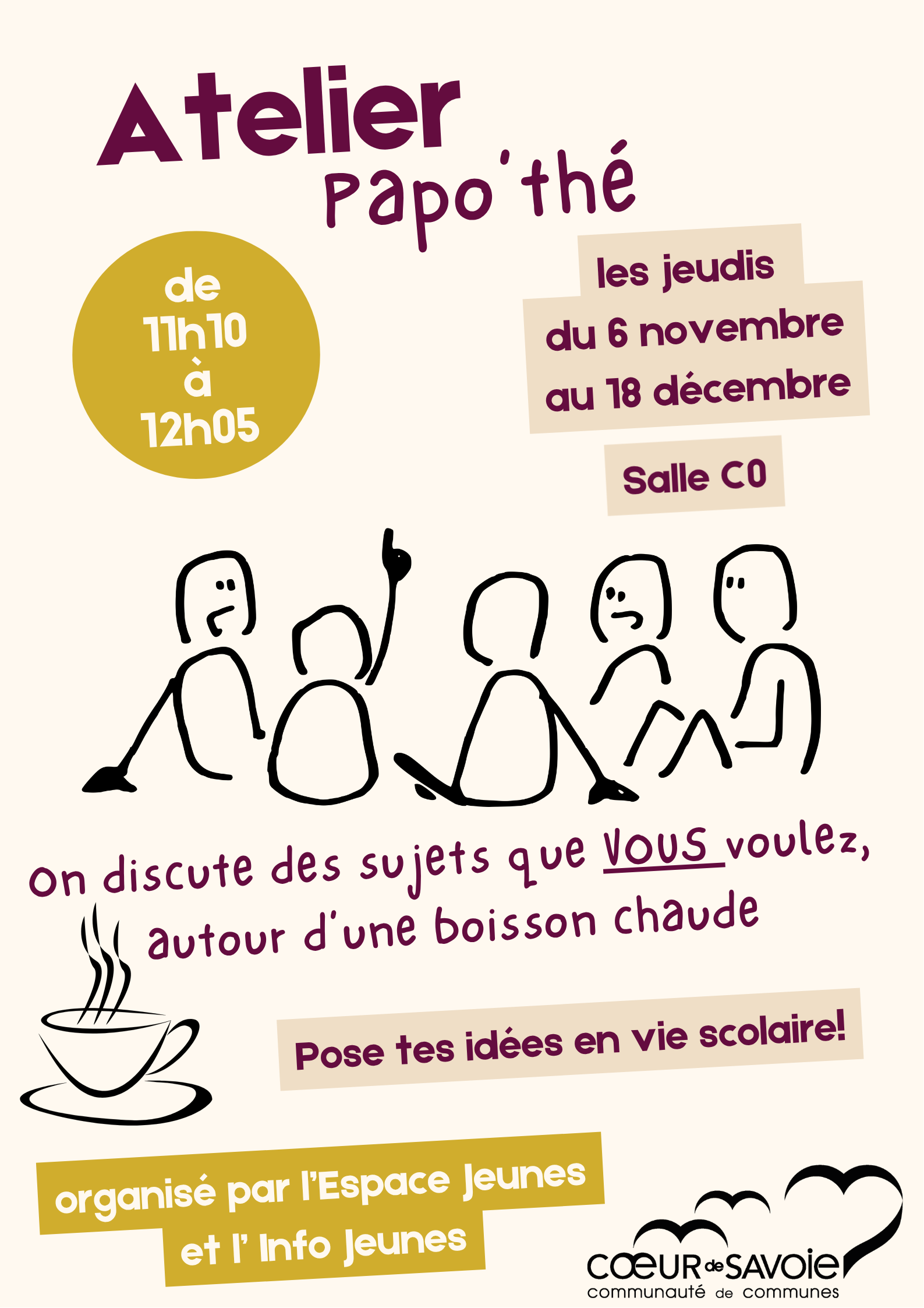 Avec l'Espace Jeunes, vous pouvez participer à des ateliers les mardis et jeudis lors de la pause méridienne. Le programme figure dans les pièces jointes !