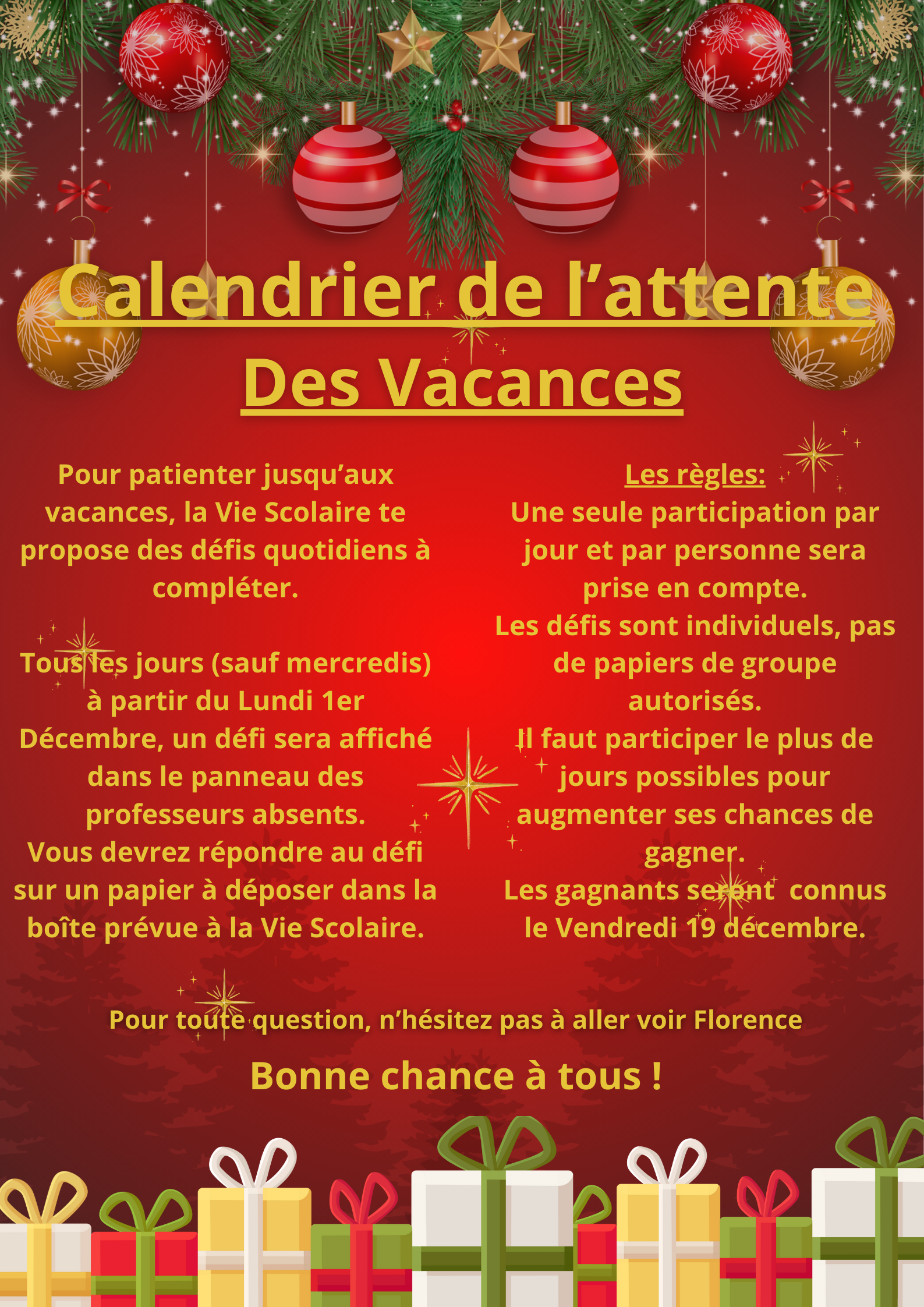 La vie scolaire organise son calendrier de l'attente : lisez la pièce jointe pour en savoir plus ;)