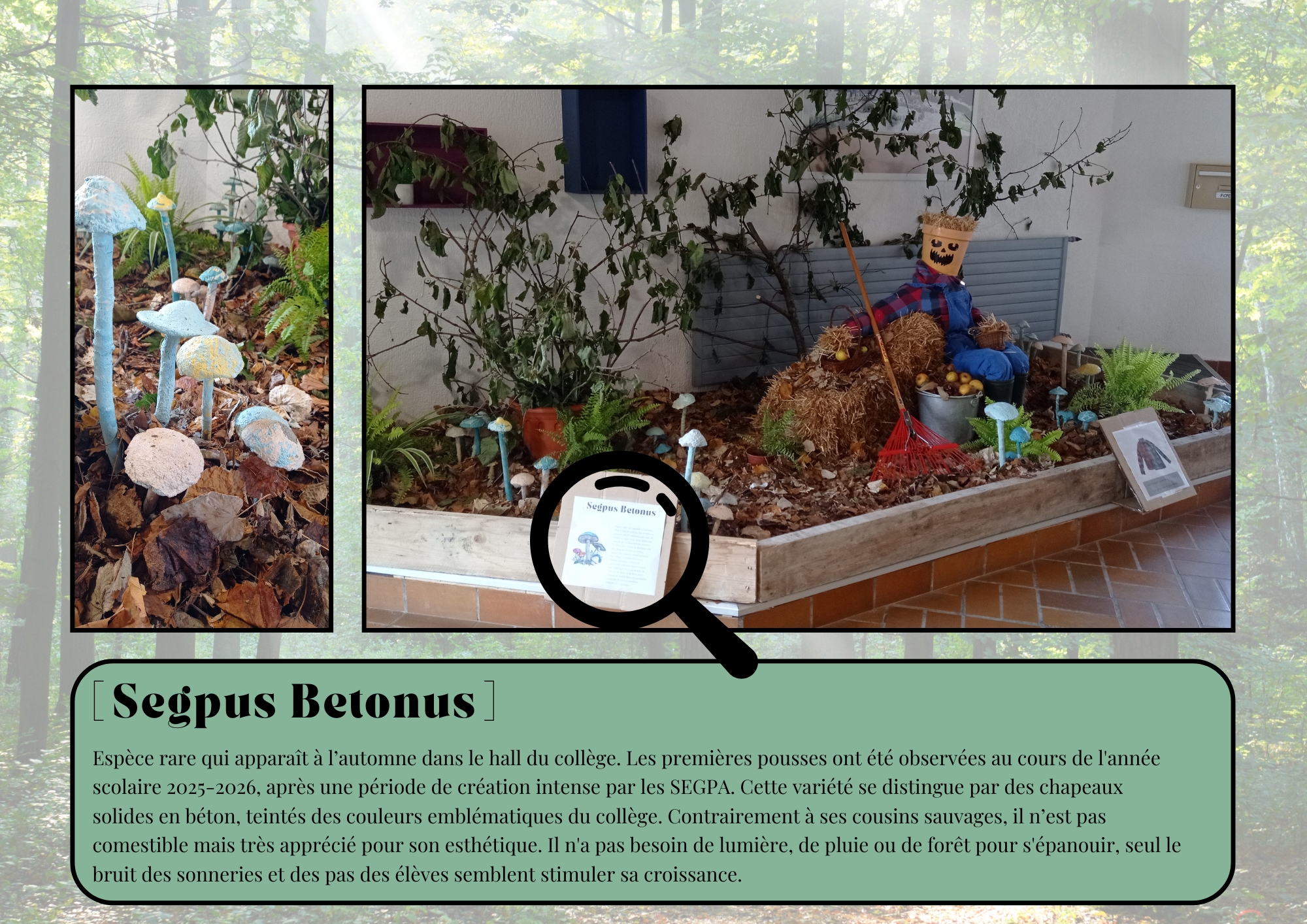 Les champignons sont en béton, décorés aux couleurs du collège, et on trouve aussi des pommes, des noix et des châtaignes, parfait pour représenter l’automne.